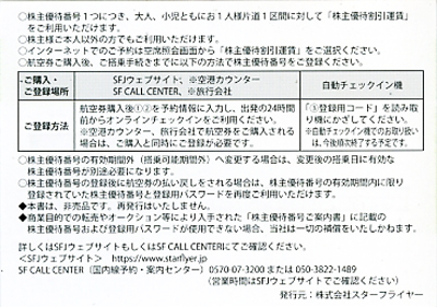 本券1枚で、スターフライヤー(SFJ)の国内営業全路線の片道1区間が、大人普通運賃(小児の場合は小児運賃)の50%割引でご利用になれます。 搭乗有効期間 搭乗有効期間 2026年5月31日 ※座席数には限りがございます。 ※(ご注意)便によっては優待割引設定がない場合がございますので、優待券ご購入の前に搭乗予定便の割引設定内容をスターフライヤーへご確認くださいませ。 ※優待券の裏面をご確認の上、ご利用して下さい。 ※株主優待割引は他の割引運賃とは併用できません。 ※スターフライヤー空港カウンターまたはスターフライヤーの航空券取扱旅行会社等でお使い頂けます。 .
